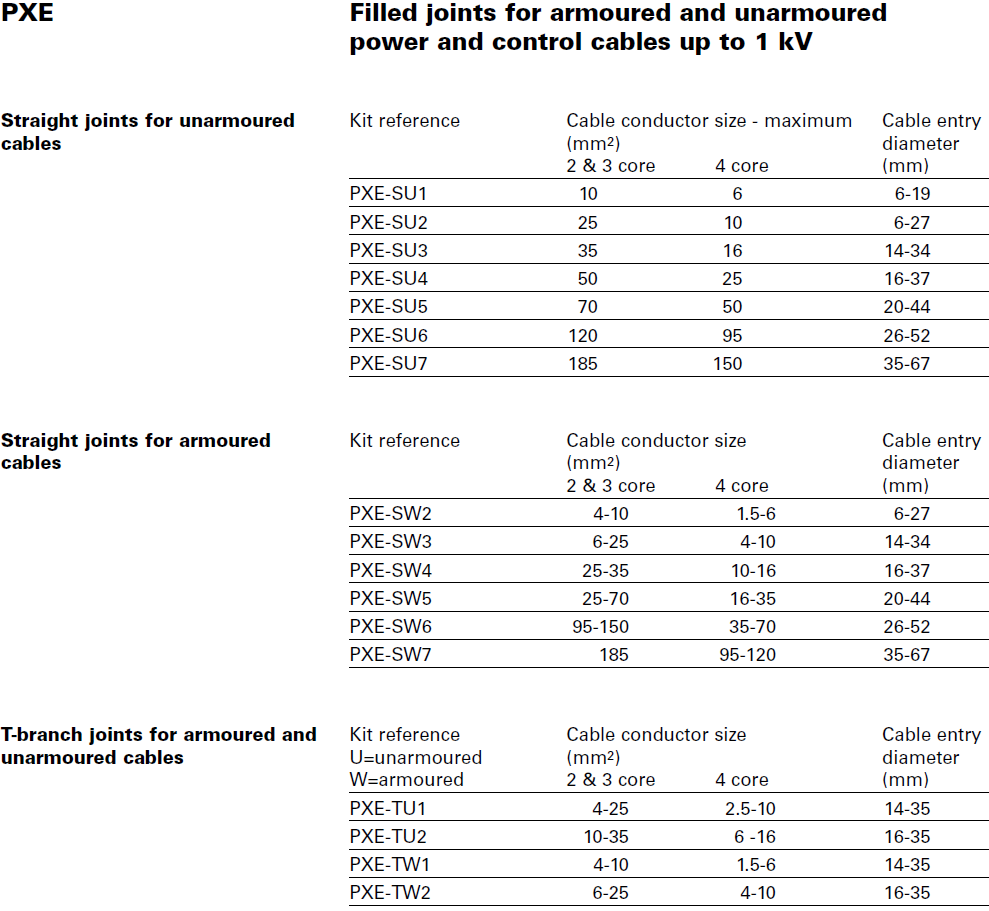 PXE (Performance x Economy), filled joints for armoured and unarmoured power and control cables up to 1 kV
